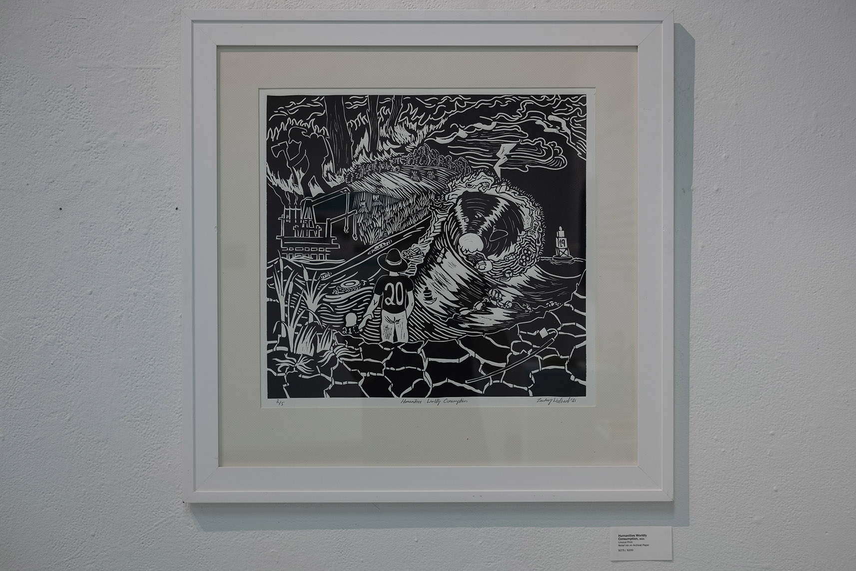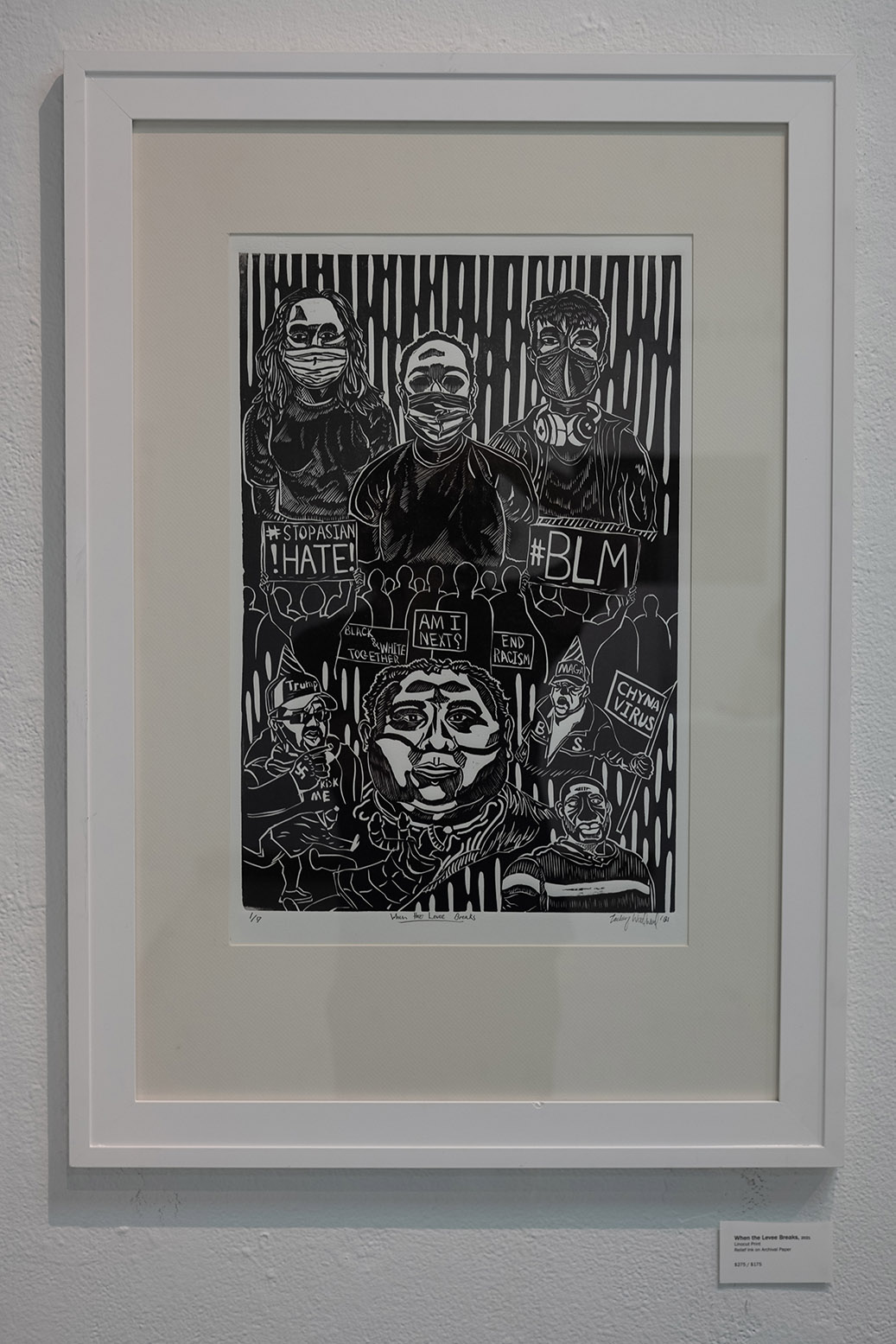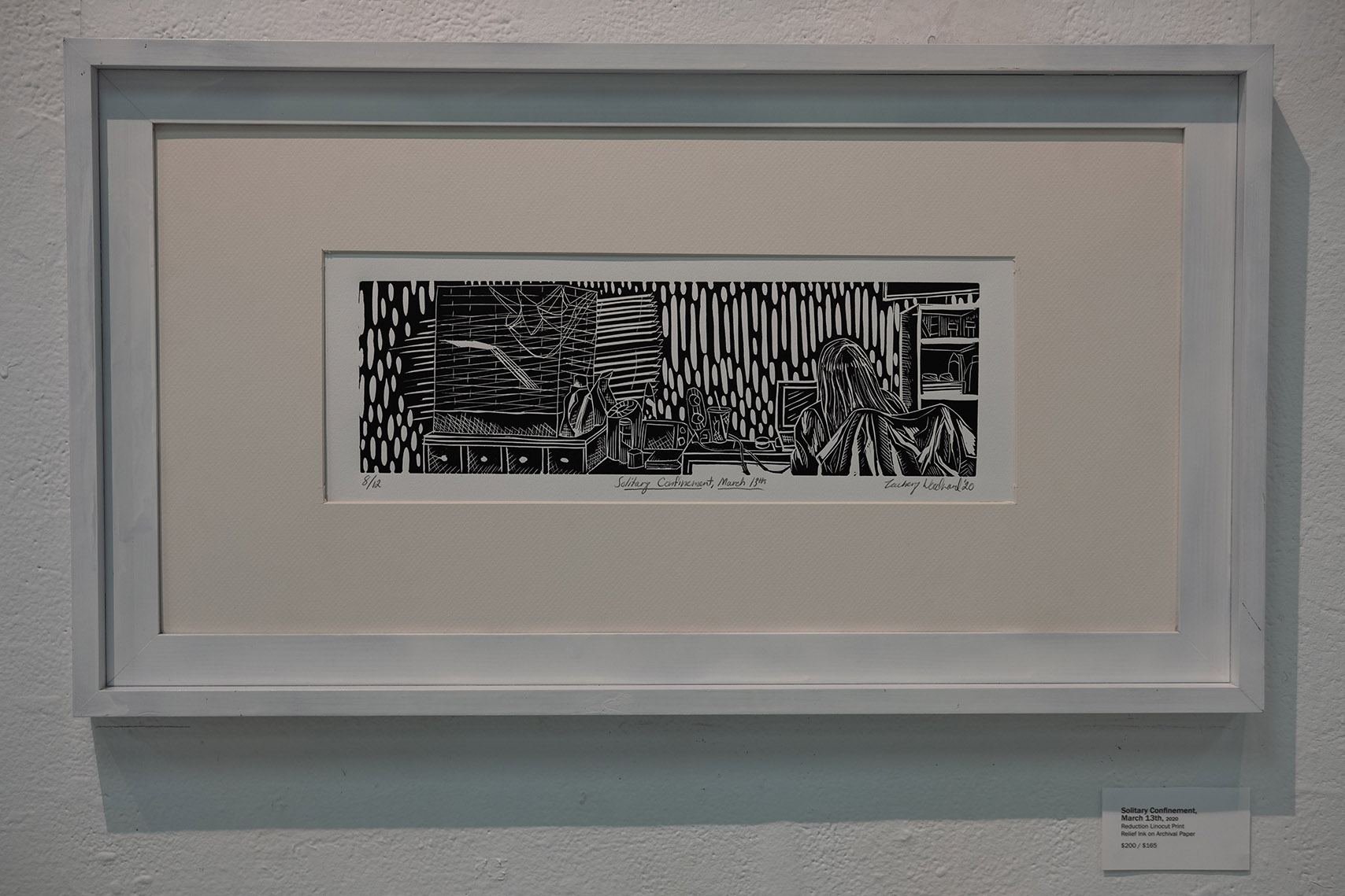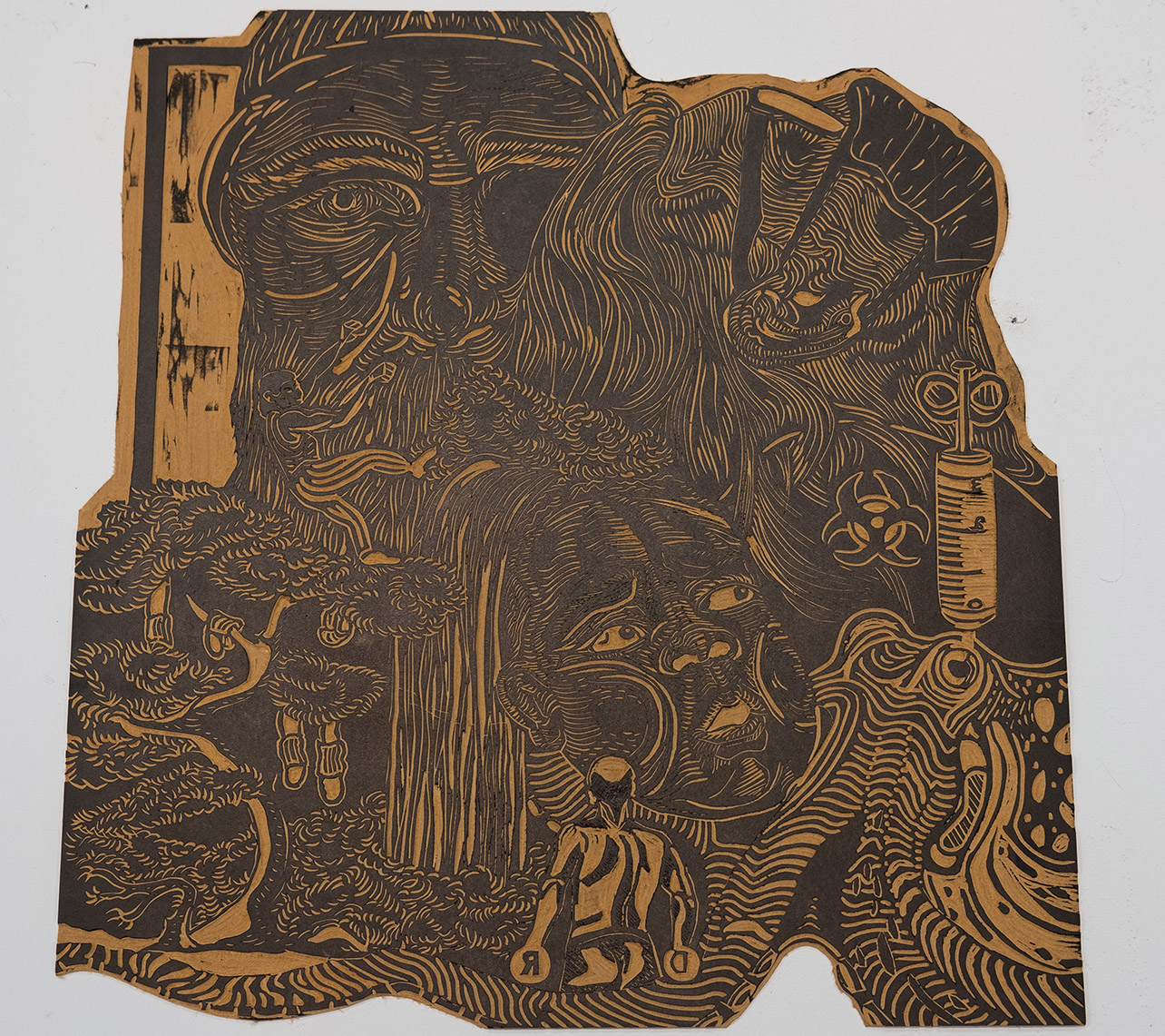 My current project “Life Through Linoleum” explores the modern aspects of the human condition as experienced and observed by my friends, family, and peers, as well as myself through internal and external self-reflection. The topic of the human condition has widely been studied and explored before me, but like many things it is constantly evolving alongside us as we undergo new situational elements and issues that change its definition; and therefore I took increased interest and distinct observation in encapsulating these experiences and providing a new and current perspective on the events that we each experience individually, but that affect us as a collective community. Examples of this can be seen throughout the work displayed in the exhibition such as imagery synonyms with recent events like that of “The Black Lives Matter movement”, The Covid-19 pandemic, Climate change and pollution, and inner self reflection.