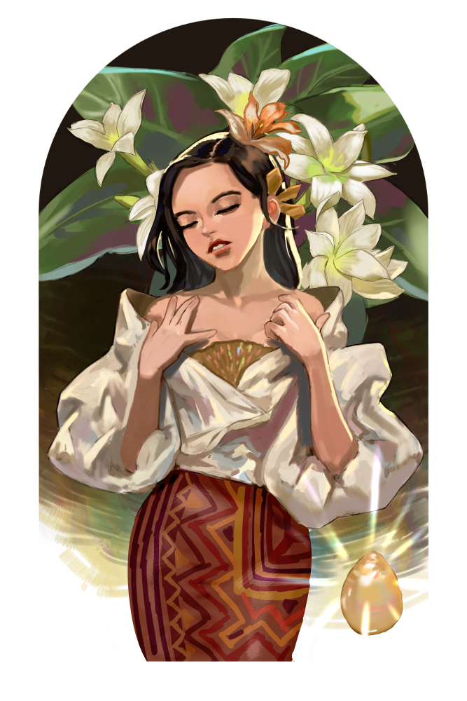 by sampaguitas with a South Sea Pearl at her side, meant to be a cultural homage.