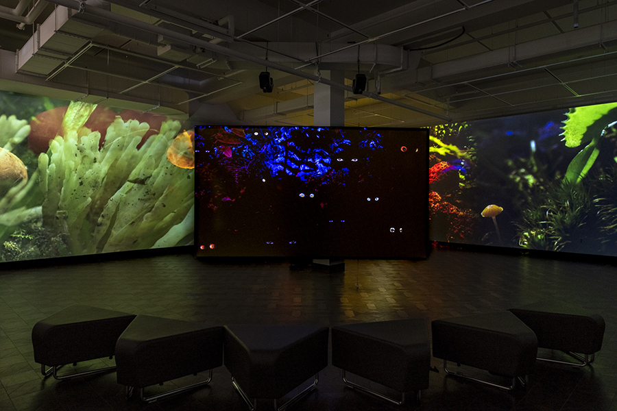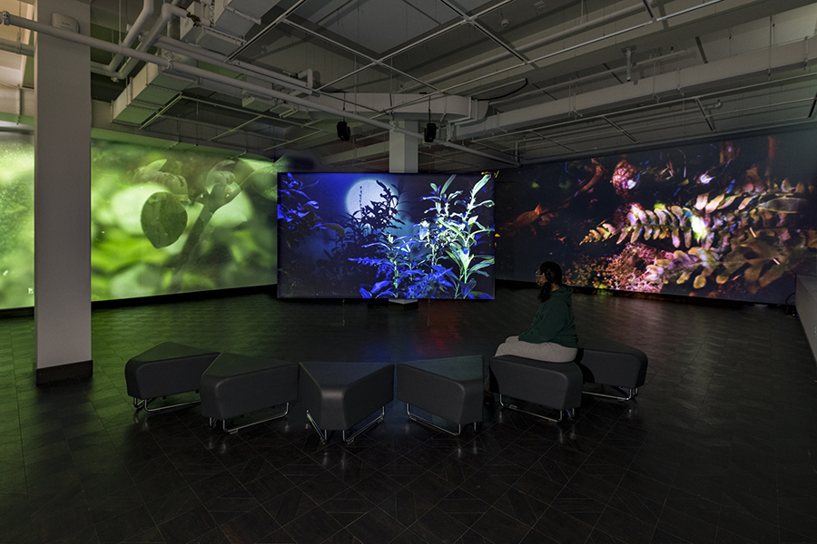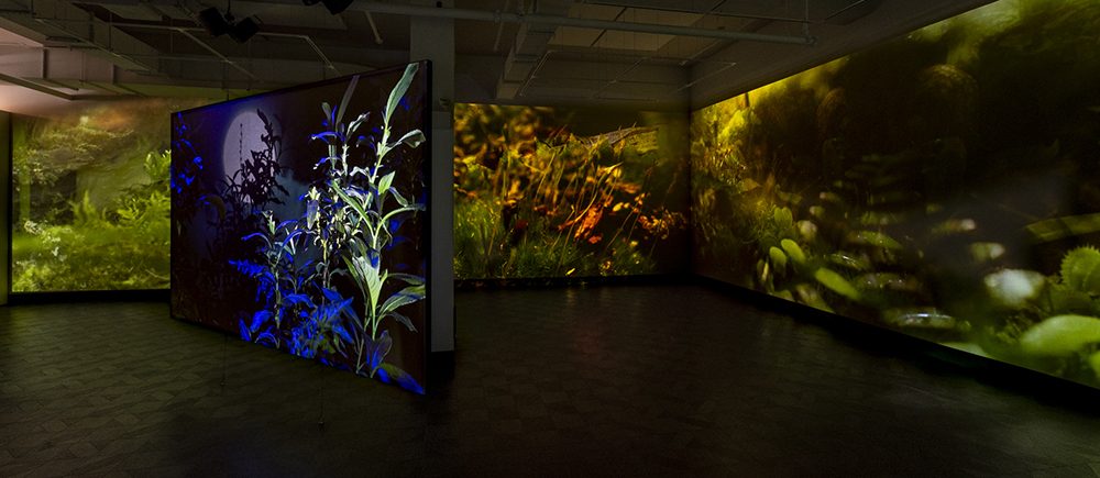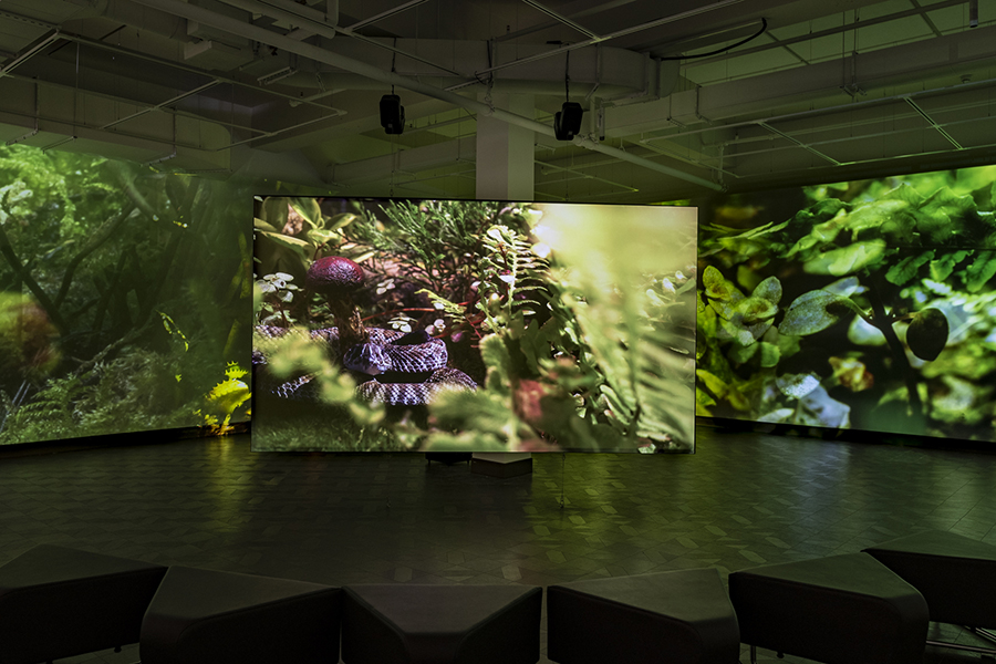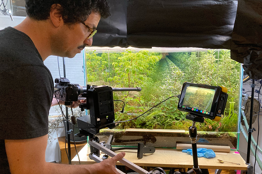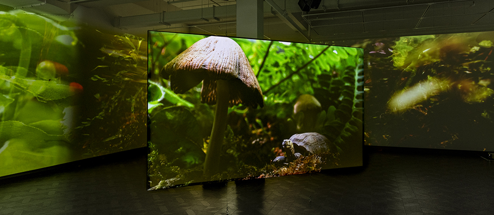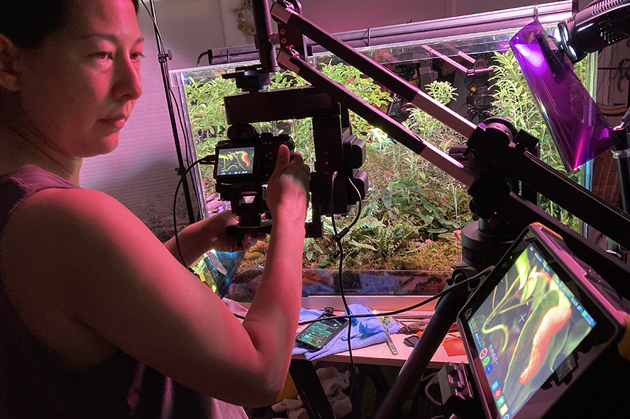 In Field Companion, the forest has been condensed and transplanted to a terrarium in the artists' studio. Twelve cubic feet of pines, shrubs, ferns, moss, fungus and carnivorous plants are reflected infinitely in the terrarium's mirrored walls and captured with a motion-controlled camera and specialized macro lens that dramatically shift the scale and perspective of this miniature landscape. Living dwellers—snails, slugs, and insects inhabit the miniature ecosystem, accompanied by digitally rendered part-animal, part-human creatures. Through their conversations and interactions, they look forward, investigating progressive methods of sustainability. Bringing attention to questions surrounding social responsibility and community, Hironaka and Suib transform their microcosmic film set into the home of chimeric forest dwellers who consider themes of precarity, mutualism, and collaborative survival.