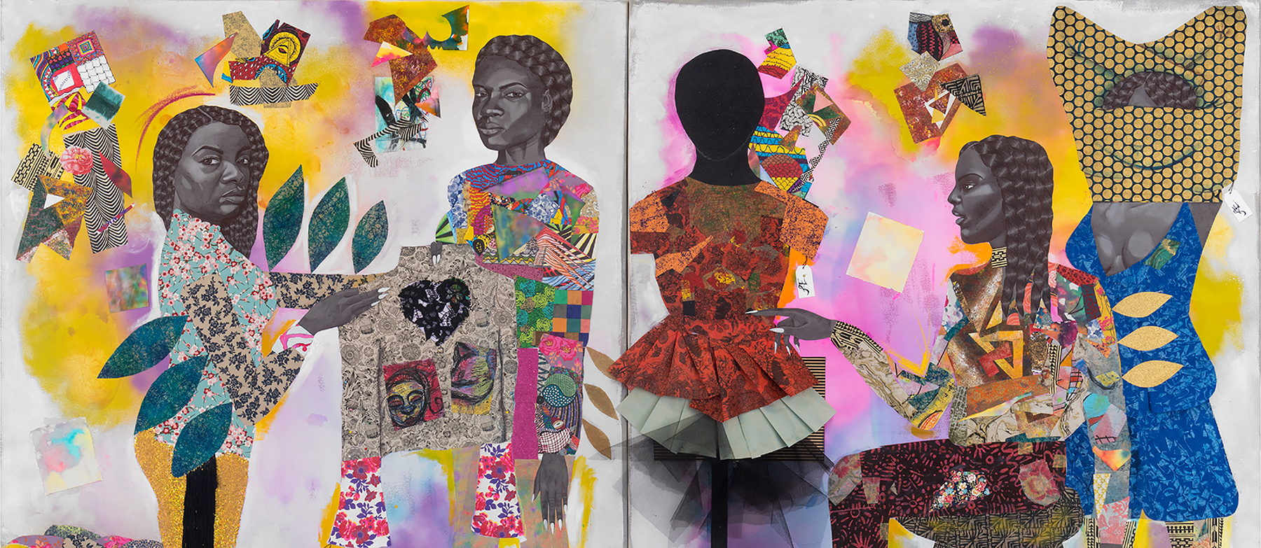 Across her multi-layered collages, the artist expresses the intersections of black style, capitalism, fashion, and personal identity. The female subjects live in ambiguously abstracted spaces that acts as its own coded language while they engross the viewer with their agency as conveyors of black culture.