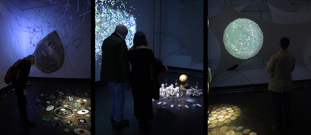 Phillips’ videos are projections on the sculptural forms that bring the installation to life by animating the objects. Imagery used includes a slowly undulating web of filaments reminiscent of neuron cells, while other visuals can be seen as membranes and molecules interacting in transparent globes. Overall, these projections are inspired by the immense number of complex actions performed by the trillions of molecules that make up living organisms. The associated soundscapes are composed from over 450 digital sound files, both acoustic and electronically produced, which create an active, buzzing aural environment.