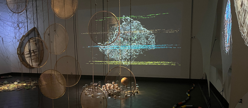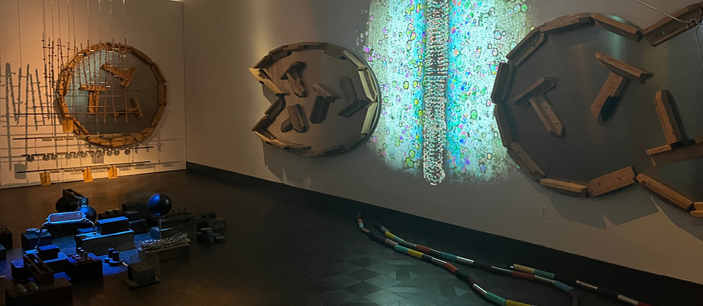 The overlapping projections and three-dimensional sculptures represent a variety of micro cellular elements such as chromosomes, electrical synapsis and threads of the nervous system, white blood cells and hemoglobin, and dividing cells from simple to complex. The objects, video, sound, and sculpture are abstracted organic imagery meant to be metaphorical, not scientific, and are a reflection of the marvel and intricacies of living processes.