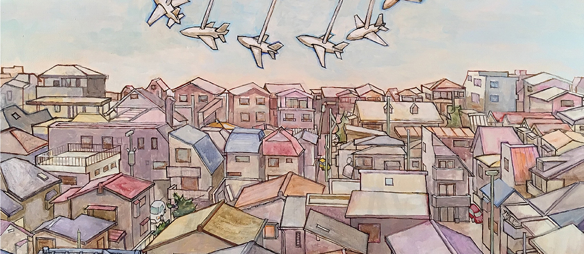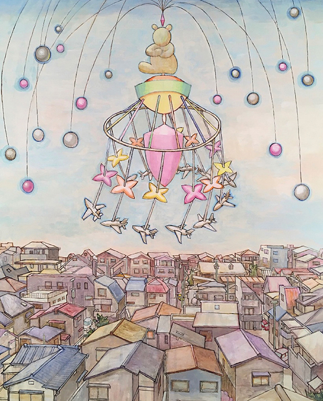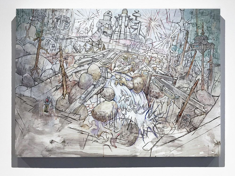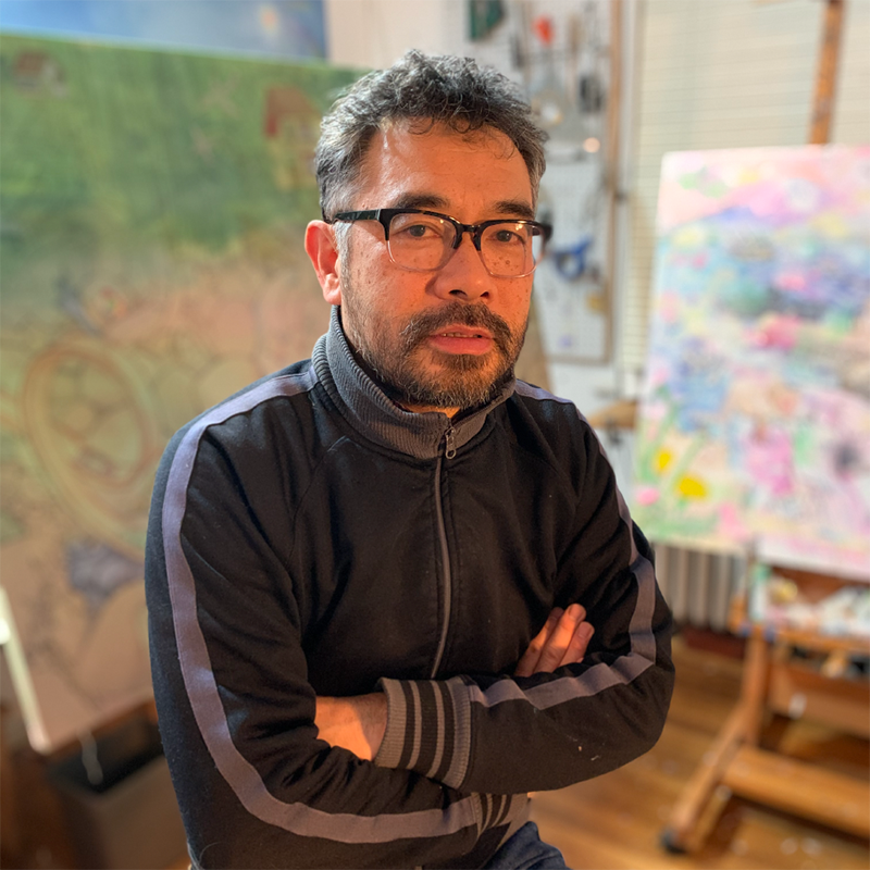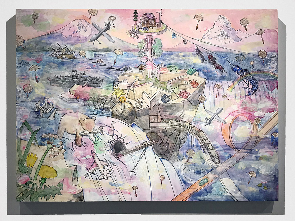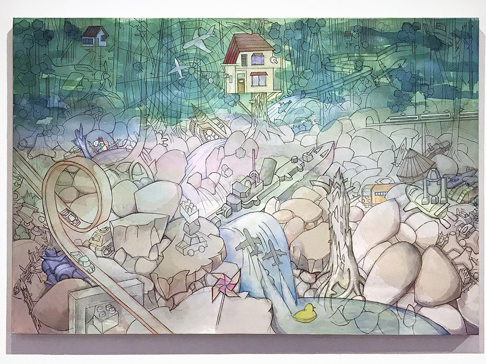 Hiro Sakaguchi was born as a twin in Nagano, Japan and grew up in Chiba City, near Tokyo. Arriving in the US in the 1990s he creates ambiguous atmospheric paintings based on his memories of life growing up in Japan. His work reflects issues of environment, ecology, science, world history, peace and conflict, and popular culture. Symbolism and narrative provide a conceptual platform for him. Models, toys, and games from childhood often appear in his works. This innocent point of departure allows Hiro to get at the heart of more current topics and adult concerns while simultaneously telling a loosely autobiographical, fictional story.