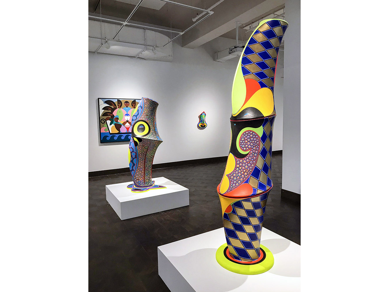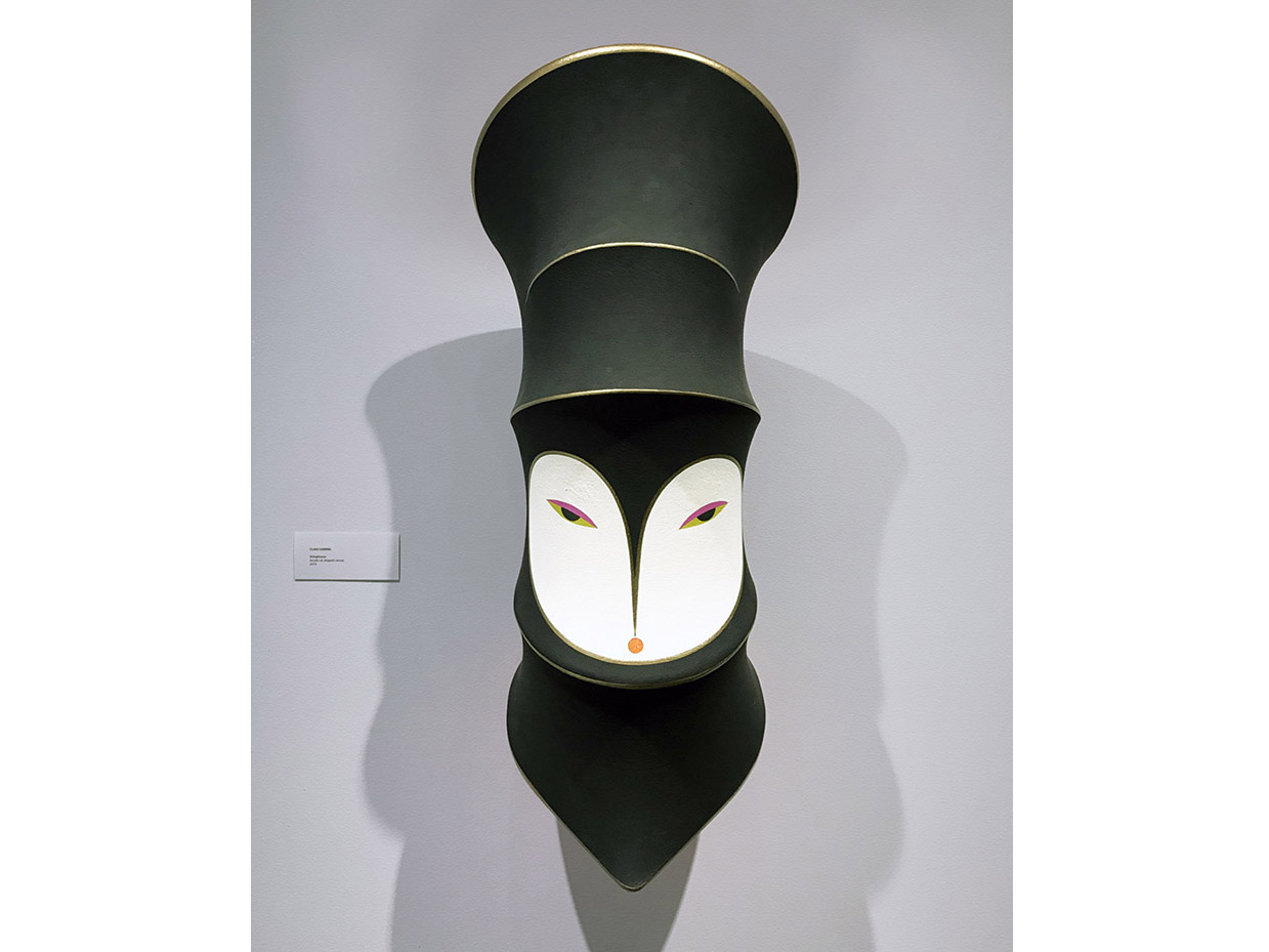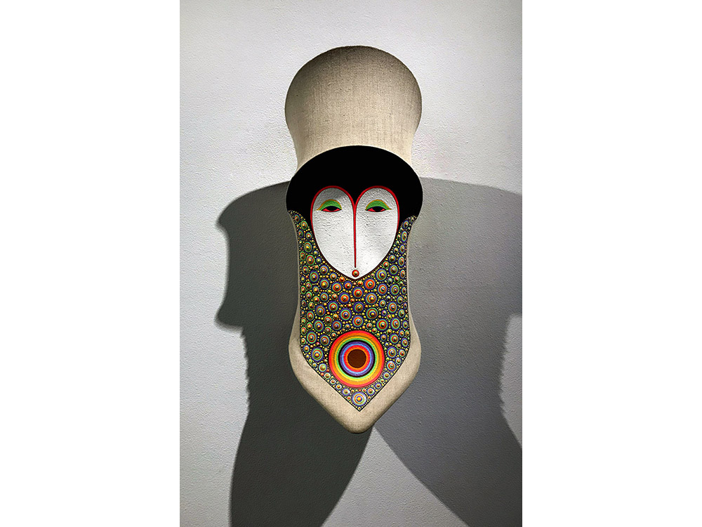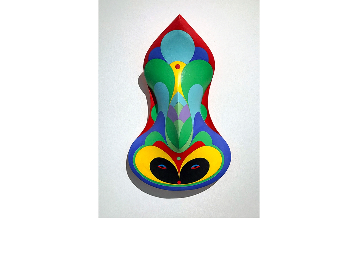 Originally from Port-au-Prince, Haiti, Claes Gabriel’s work combines the cultural richness of Haiti with contemporary practice and use of materials that mimic tribal masks and totems. The shape of each piece informs its unique personality, which Gabriel heightens with bright color, eyes, and lips. Gabriel’s first influence was his father, Jacques Gabriel (1934–1988), a classically-trained painter who depicted the lushness and vibrant life of Haiti in his own paintings. He was also influenced by contemporary artists such as Frank Stella and Sam Gilliam. Referencing Haitian culture through color, folklore, and his own imagined tales, Gabriel creates a mythical like presences in each artwork.
