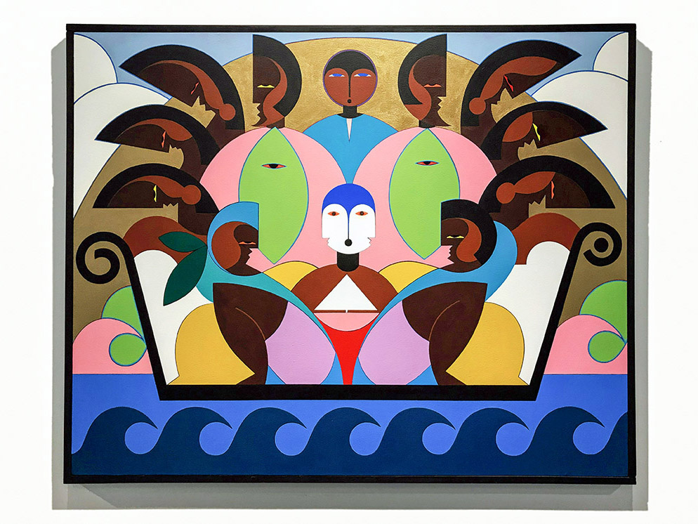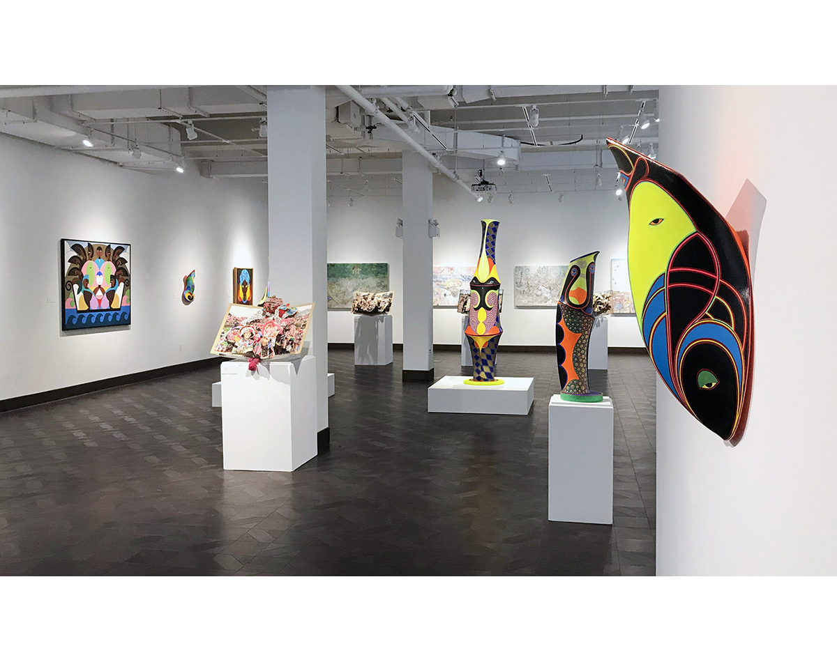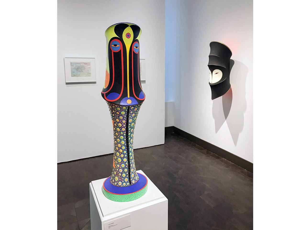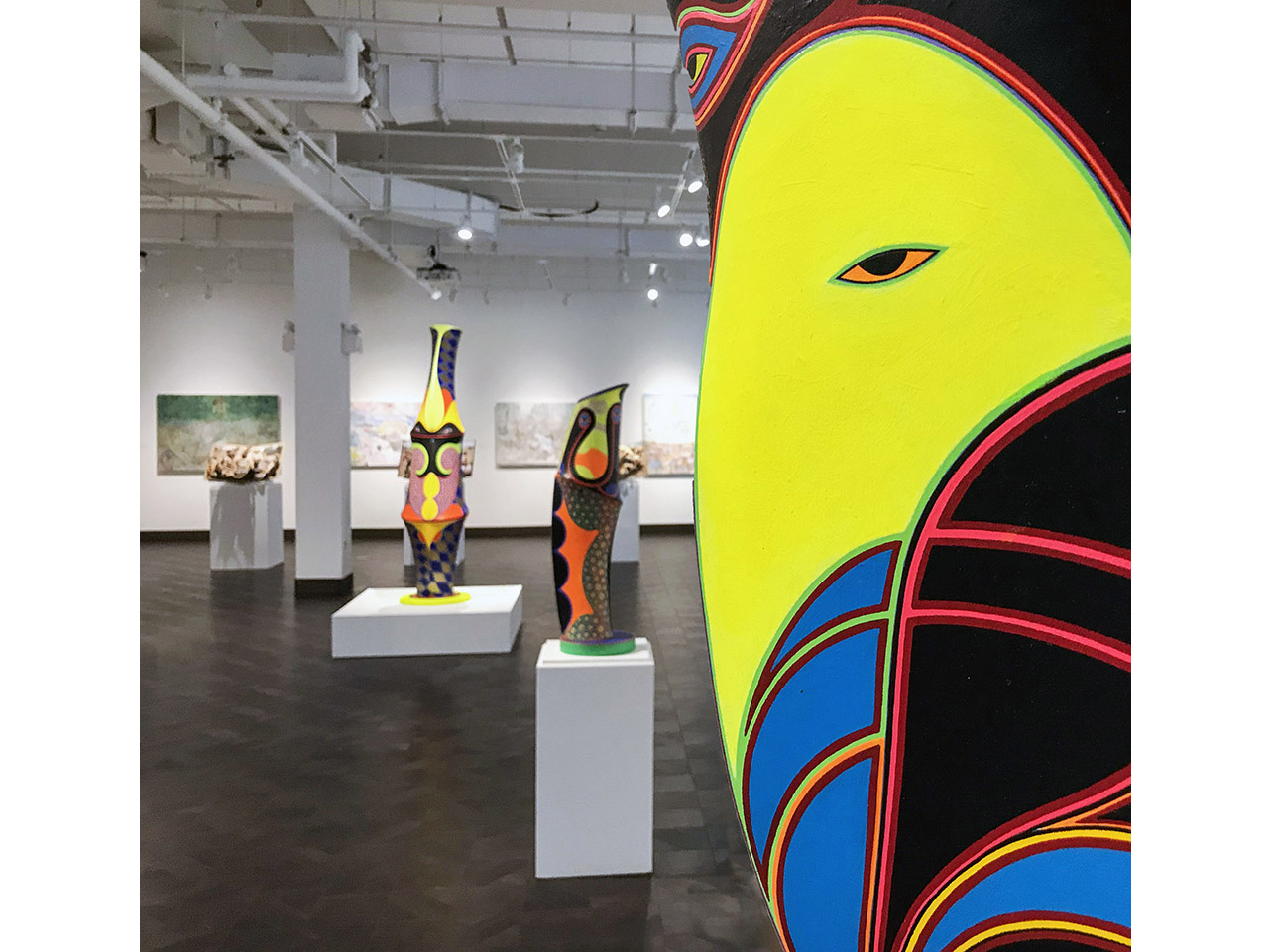 Originally from Port-au-Prince, Haiti, Claes Gabriel’s work combines the cultural richness of Haiti with contemporary practice and use of materials that mimic tribal masks and totems. The shape of each piece informs its unique personality, which Gabriel heightens with bright color, eyes, and lips. Gabriel’s first influence was his father, Jacques Gabriel (1934–1988), a classically-trained painter who depicted the lushness and vibrant life of Haiti in his own paintings. He was also influenced by contemporary artists such as Frank Stella and Sam Gilliam. Referencing Haitian culture through color, folklore, and his own imagined tales, Gabriel creates a mythical like presences in each artwork.