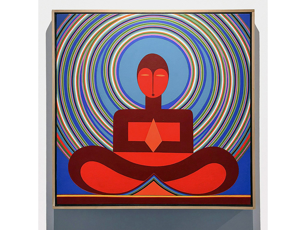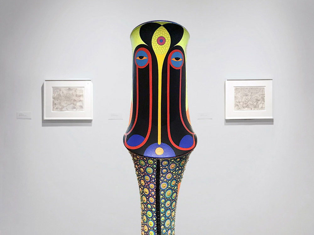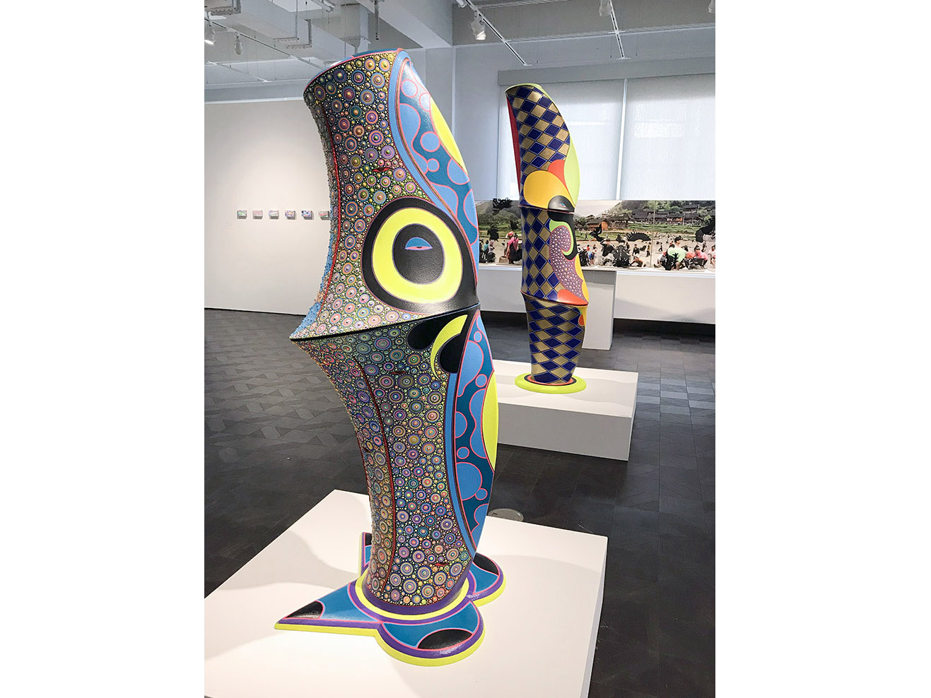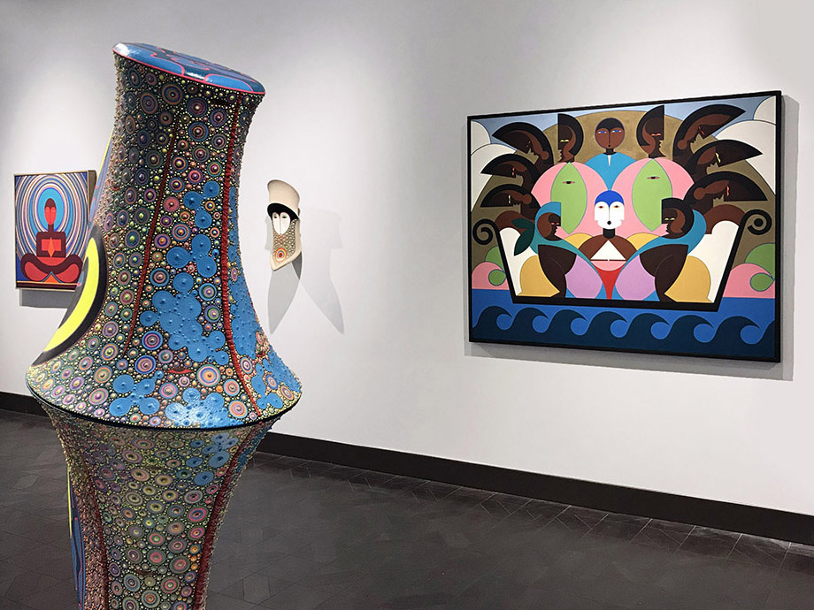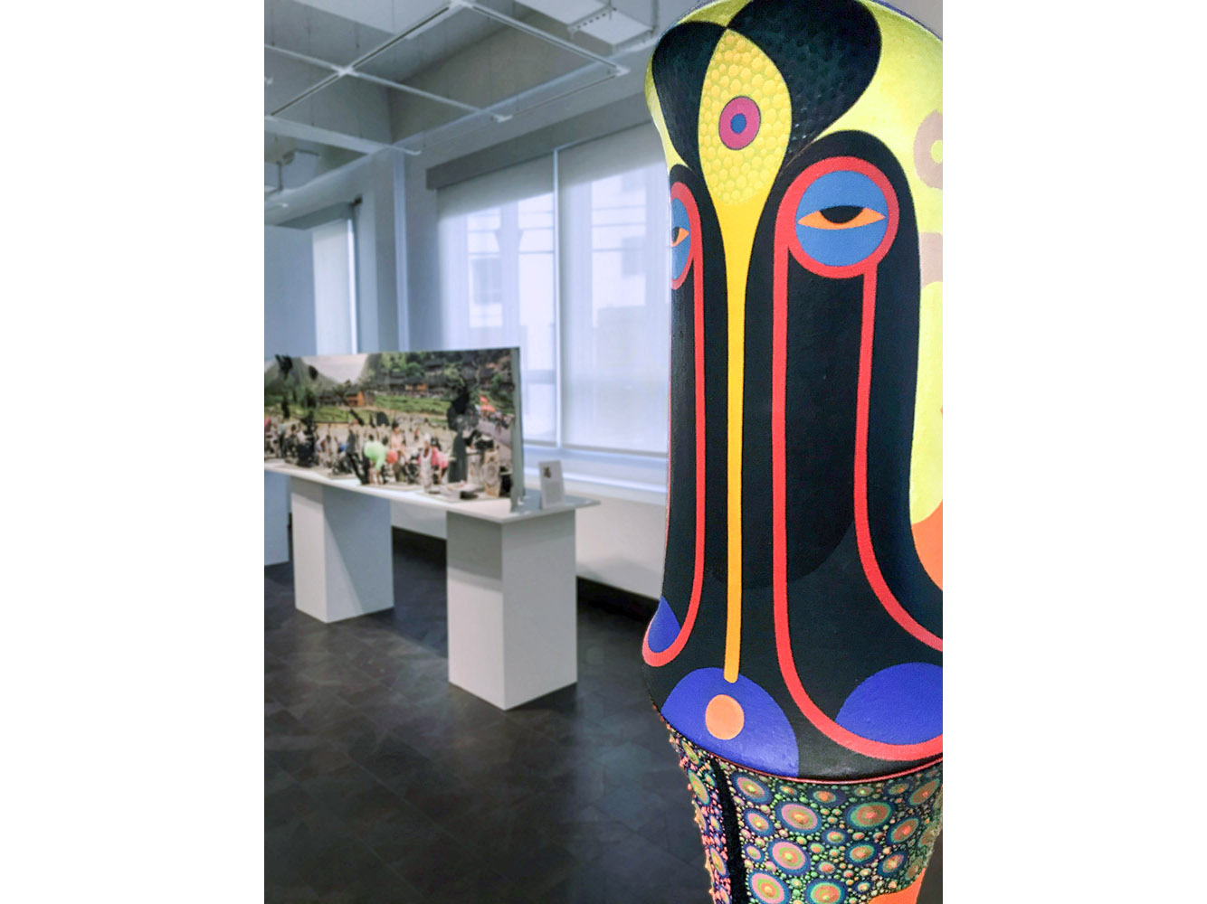 Originally from Port-au-Prince, Haiti, Claes Gabriel’s work combines the cultural richness of Haiti with contemporary practice and use of materials that mimic tribal masks and totems. The shape of each piece informs its unique personality, which Gabriel heightens with bright color, eyes, and lips. Gabriel’s first influence was his father, Jacques Gabriel (1934–1988), a classically-trained painter who depicted the lushness and vibrant life of Haiti in his own paintings. He was also influenced by contemporary artists such as Frank Stella and Sam Gilliam. Referencing Haitian culture through color, folklore, and his own imagined tales, Gabriel creates a mythical like presences in each artwork.