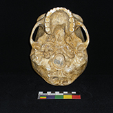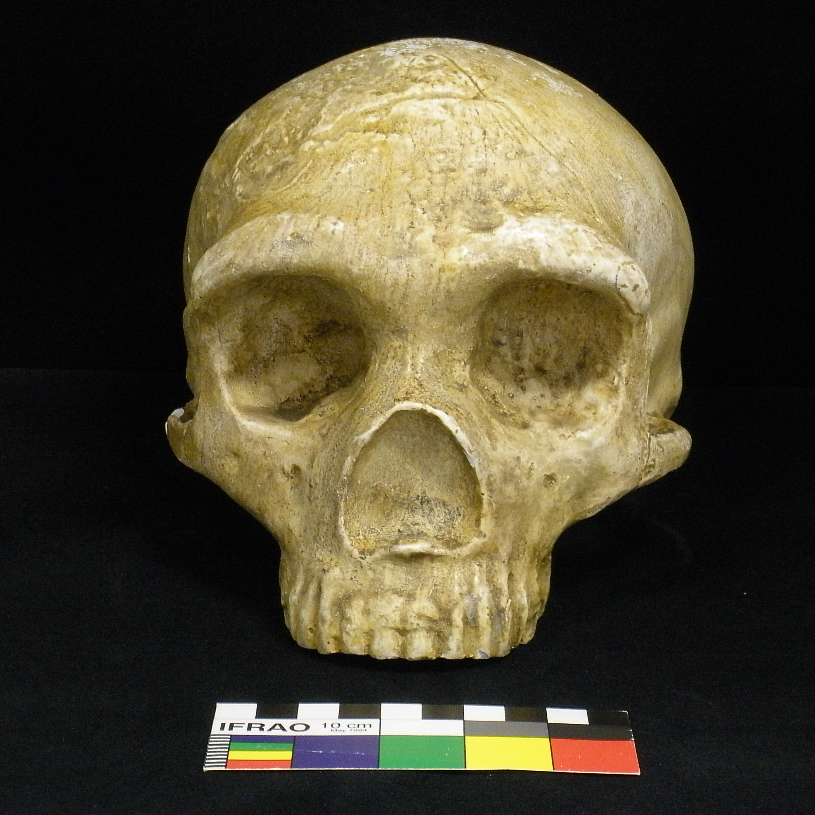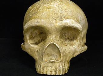 This is a replica of an Archaic Homo sapiens skull. The maximum cranial length of the skull is 17.5cm and the Basion-bregma height is 12.5cm. According to the map picoted below, Archaic Homo-sapiens remains have been found throughout parts of Europe, East Africa and Eastern China and roamed the earth about 100,000-200,000 years ago. Archaic Homo sapiens used tools such as wooden spears and hand axes for hunting food. Archaic Homo sapiens most likely traveled and hunted in groups, which made survival easier on the group. Physically, Archaic Homo sapiens were built similar to today’s man, but more rugged and robust. Their facial features differed a bit because the brow ridge would protrude over the eyes more than today’s modern man. The skull pictured below has a prominent brow bone above the eyes.